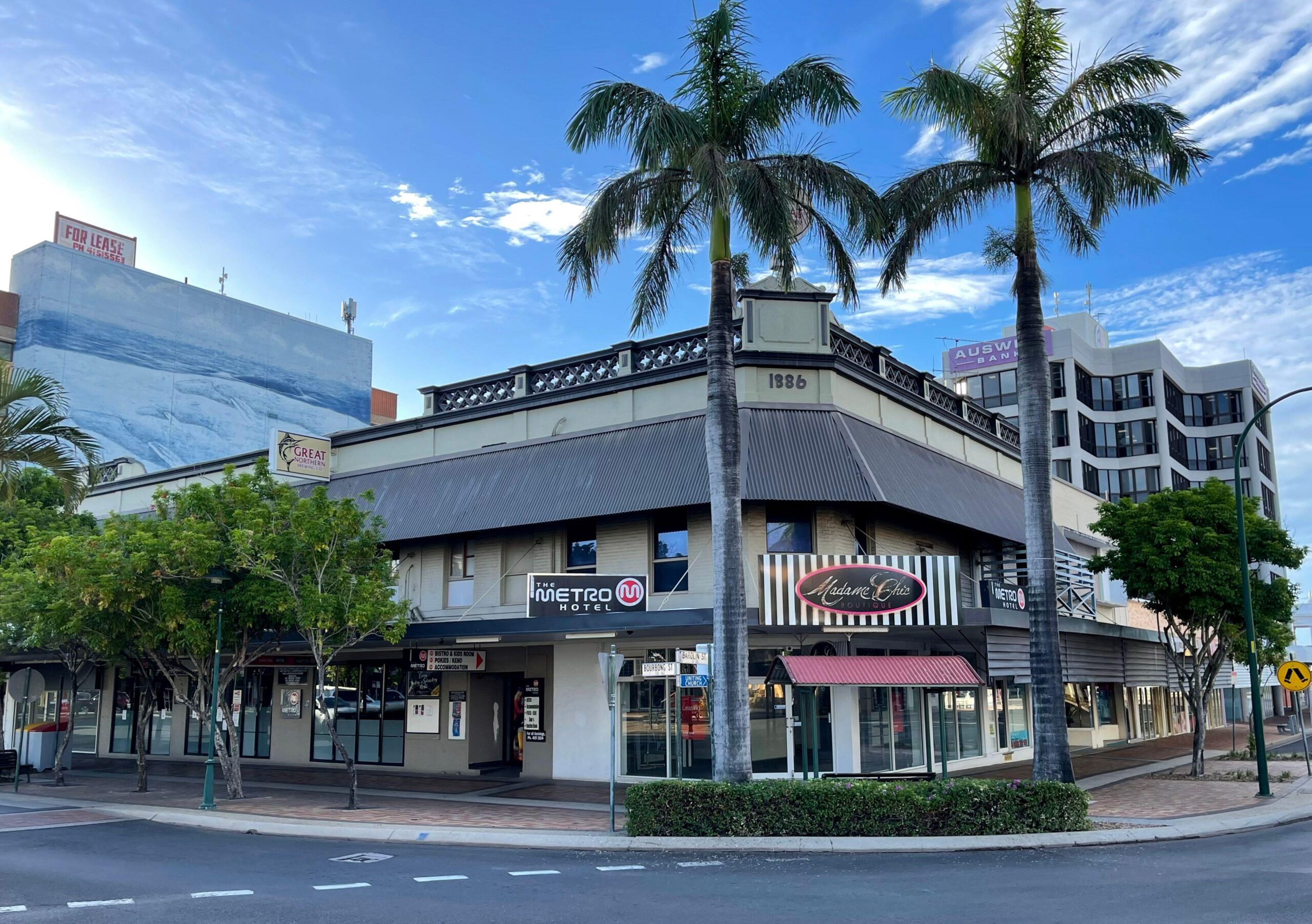 Located in the city centre of Bundaberg on Burbong Street, the Metro Hotel has traded since 1874 when built and licensed by Walter Adams. Known then as the Adams Hotel, it became a two-storey building in 1879, when the name was changed to the Metropolitan Hotel.